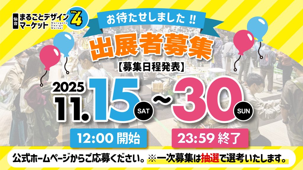 Vol.4 出展者募集スケジュールについて 2025-11-10 まるデザ管理者 以下の日程で「仙台まるごとデザインマーケット Vol.4」 の出展者募集を開始します! ご応募を検討されている方は期間内でのお申し込みをお願いいたします。今回は 抽選方式 での選考となります。先着順ではございませんのでご了承ください。 ○ 募集期間2025年11月15日(土)12:00 〜 2025年11月30日(日)23:59 皆さまのご応募を心よりお待ちしております! 2025年11月 仙台まるごとデザインマーケット運営事務局