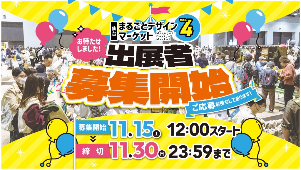 Vol.4 出展者募集を開始しました 2025-11-17 まるデザ管理者 以下の日程で「仙台まるごとデザインマーケット Vol.4」 の出展者募集を開始しました! ご応募を検討されている方は期間内でのお申し込みをお願いいたします。今回は 抽選方式 での選考となります。先着順ではございませんのでご了承ください。 ○ 募集期間2025年11月15日(土)12:00 〜 2025年11月30日(日)23:59 皆さまのご応募を心よりお待ちしております! 2025年11月 仙台まるごとデザインマーケット運営事務局