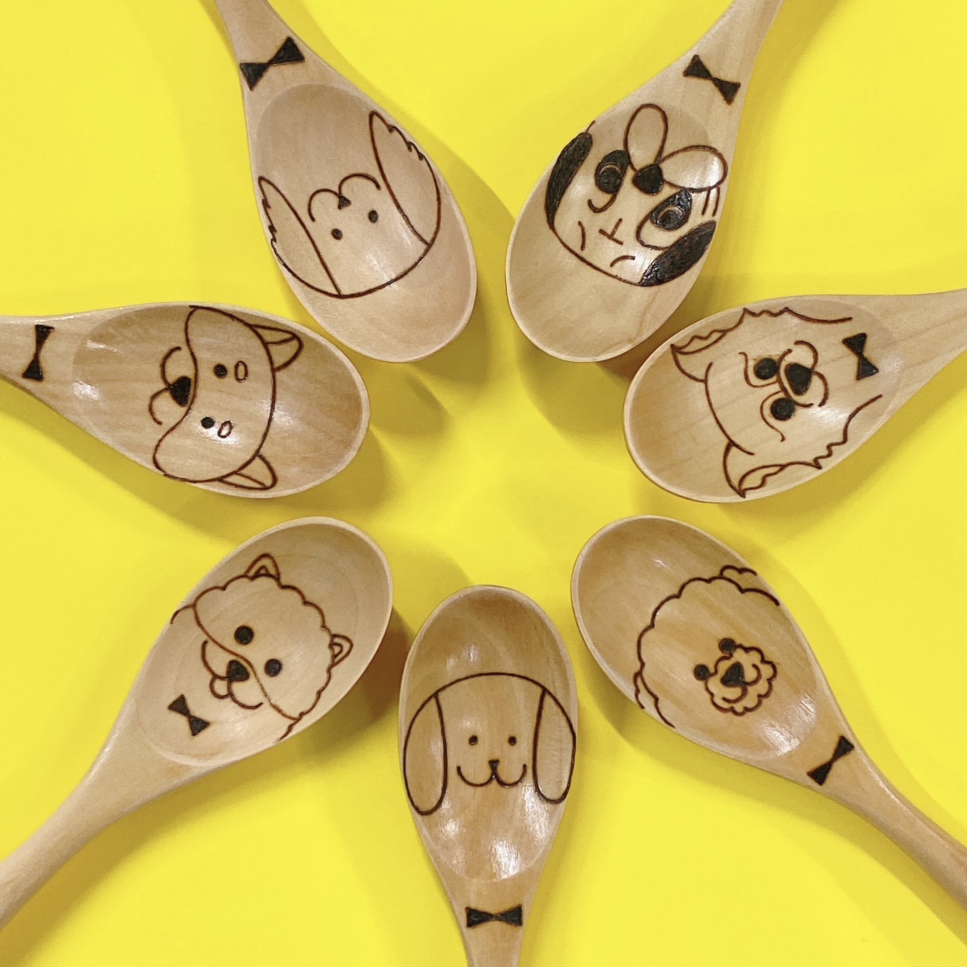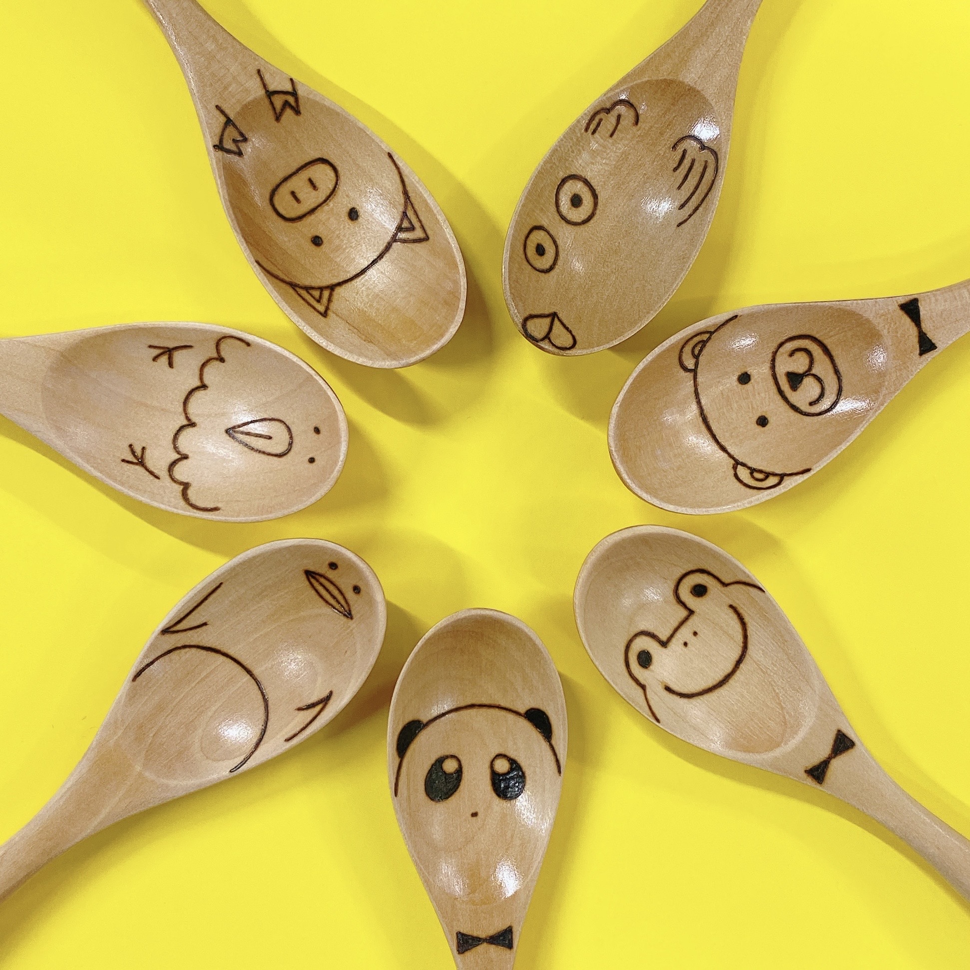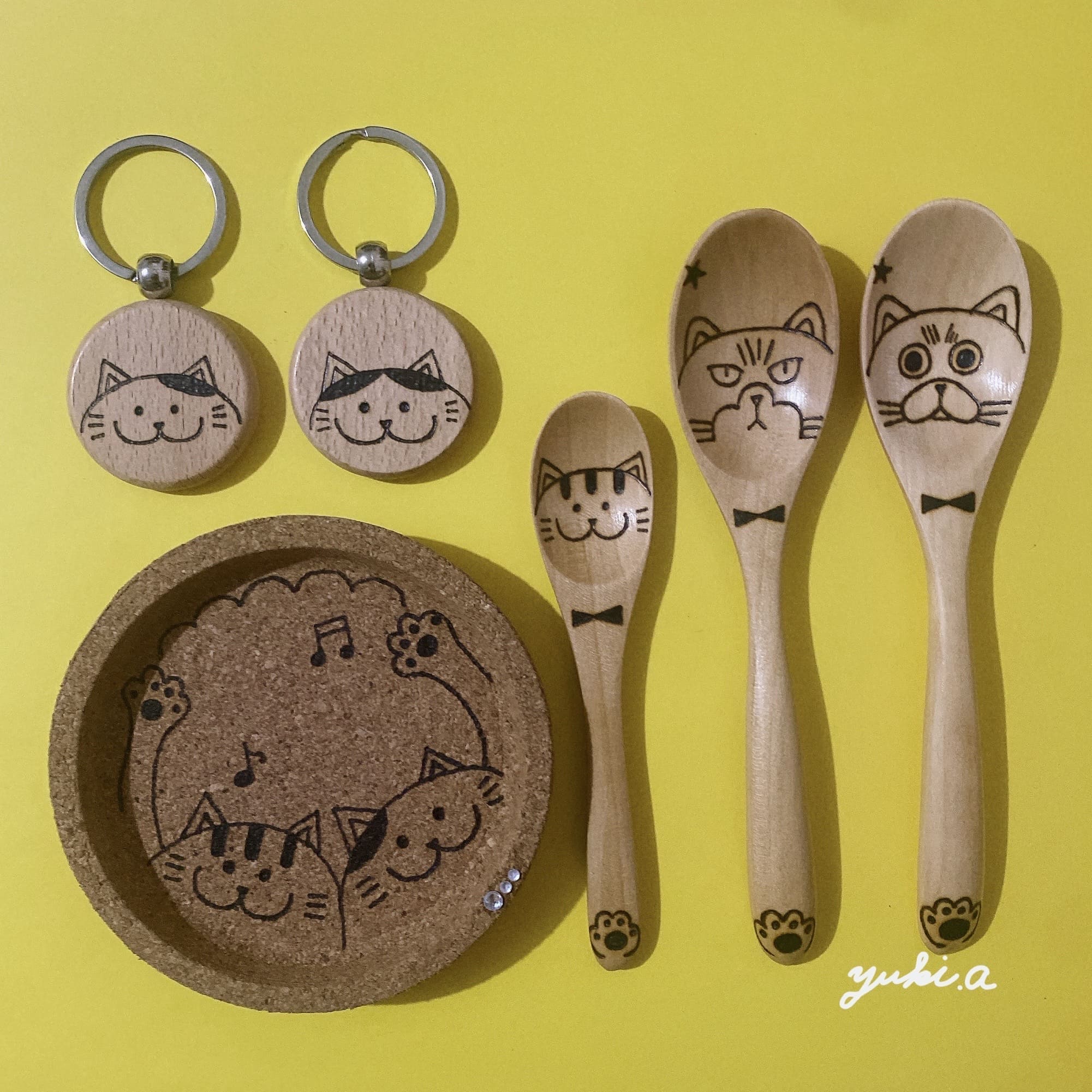 焼き絵(ウッドバーニング)を施した木製カトラリー類、木皿類、コースター、キーホルダー等