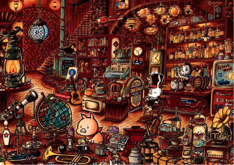架空の街を舞台にしたオリジナルのイラストアートとちょっと笑いを誘うグッズ。ポスター、ステッカー、トートバッグ、ぬいぐるみ、お守り、レザーアイテムなど