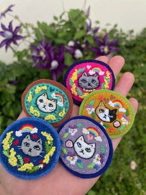 手刺繍雑貨の販売/ブローチ、ヘアゴム、巾着など