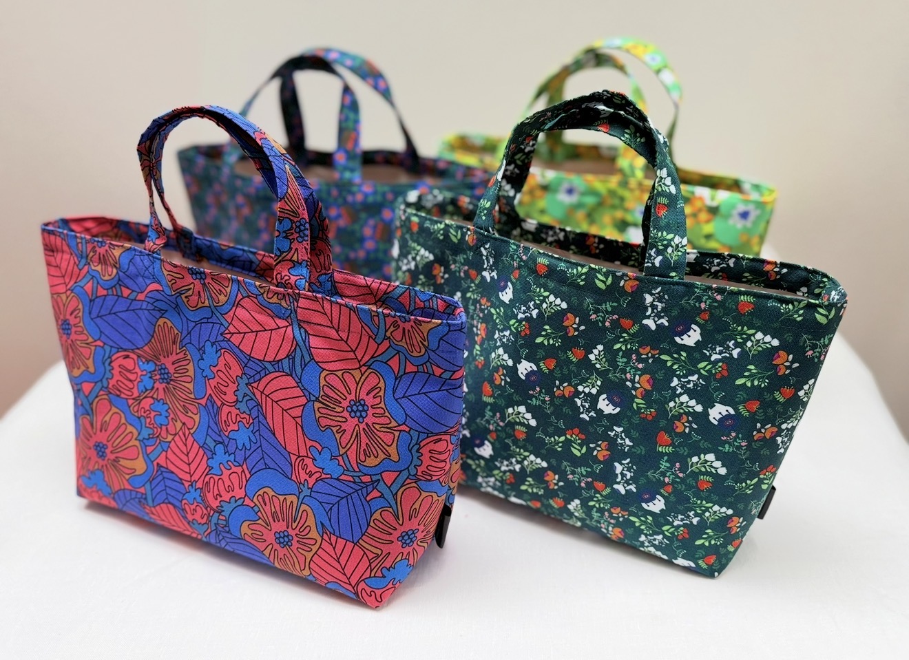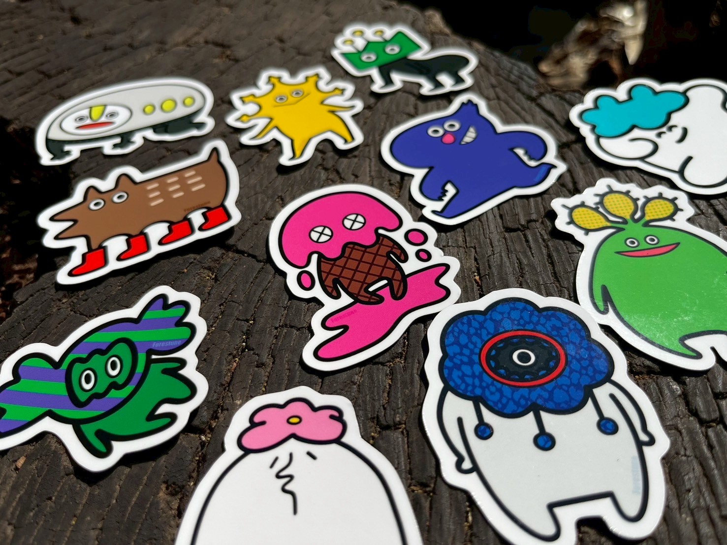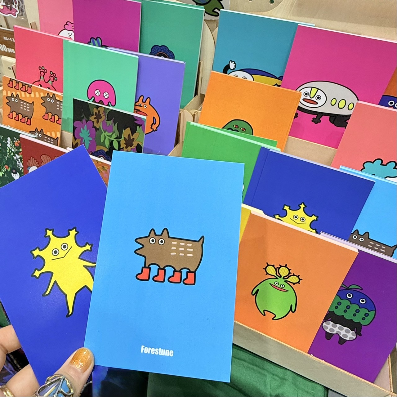 オリジナルキャラクターを使用したステッカーや缶バッジ、アクリルキーホルダー、ポストカード。オリジナルのテキスタイルを使用したバック、ポーチなど
