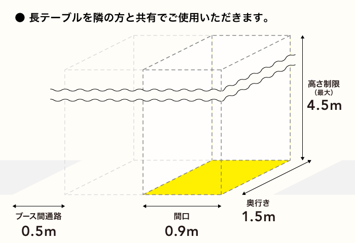 ブースの広さ | 間口:0.9m × 奥行き:1.5m 高さ制限:4.5mまで |